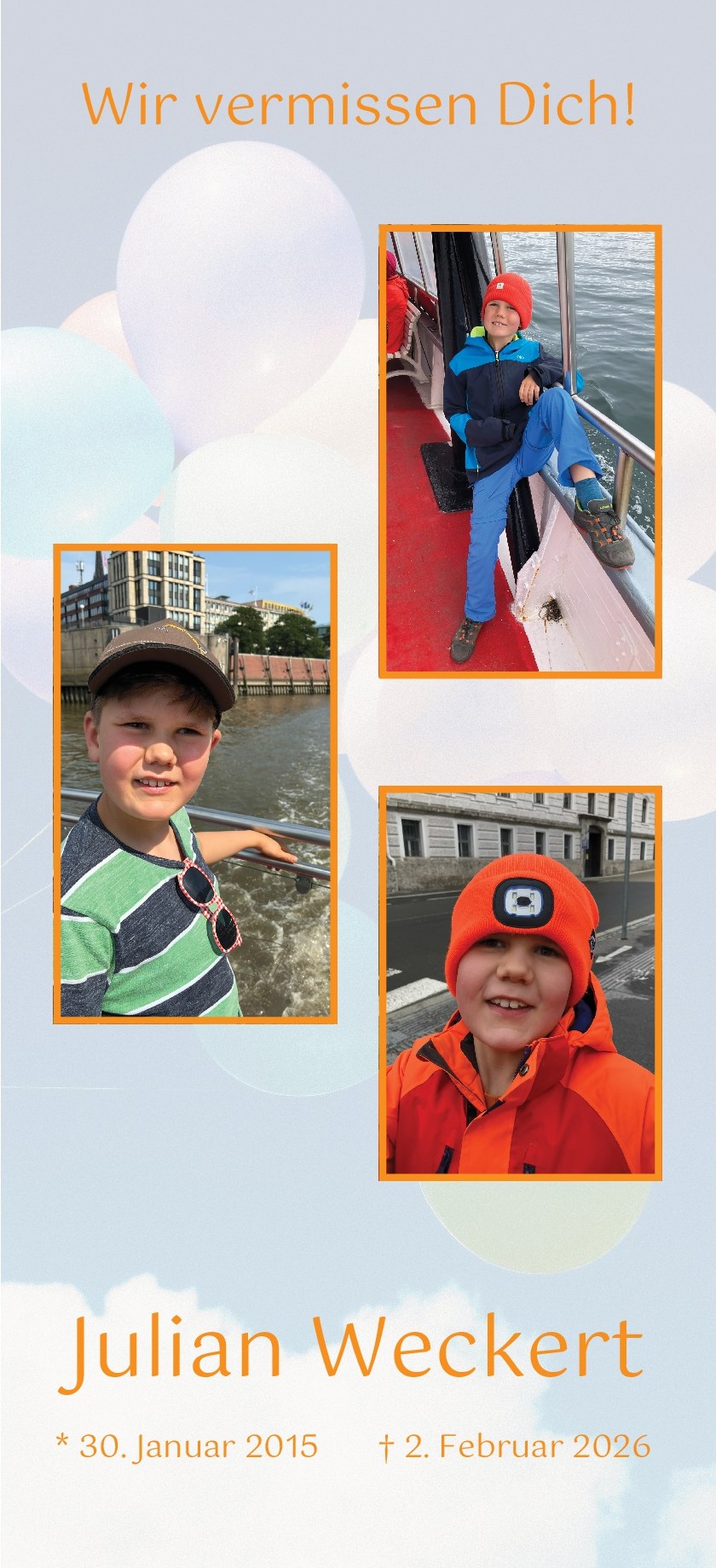Wir laden euch ein, statt Blumen einen Luftballon als Zeichen der Liebe mitzubringen, den wir gemeinsam zu Julian in den Himmel steigen lassen.